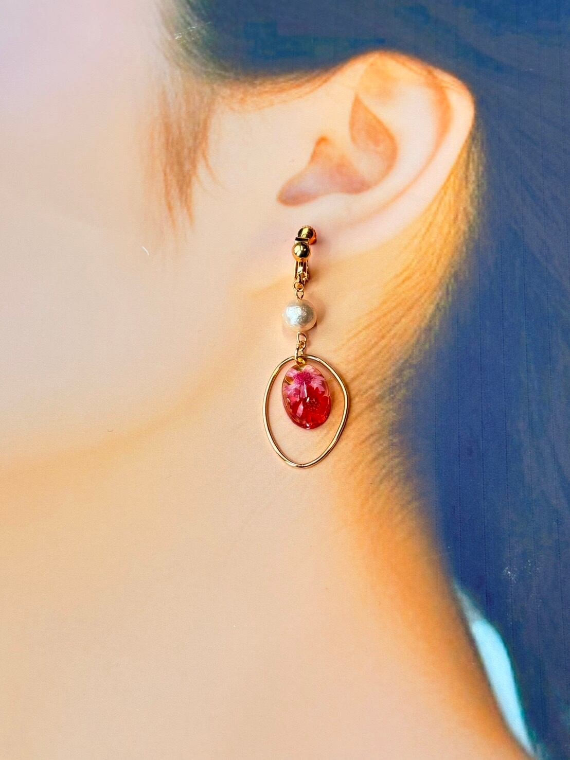 ピンクと赤のドライフラワーを閉じ込めた透明なレジンに、金色のフープとパールを組み合わせた華やかなイヤリングです