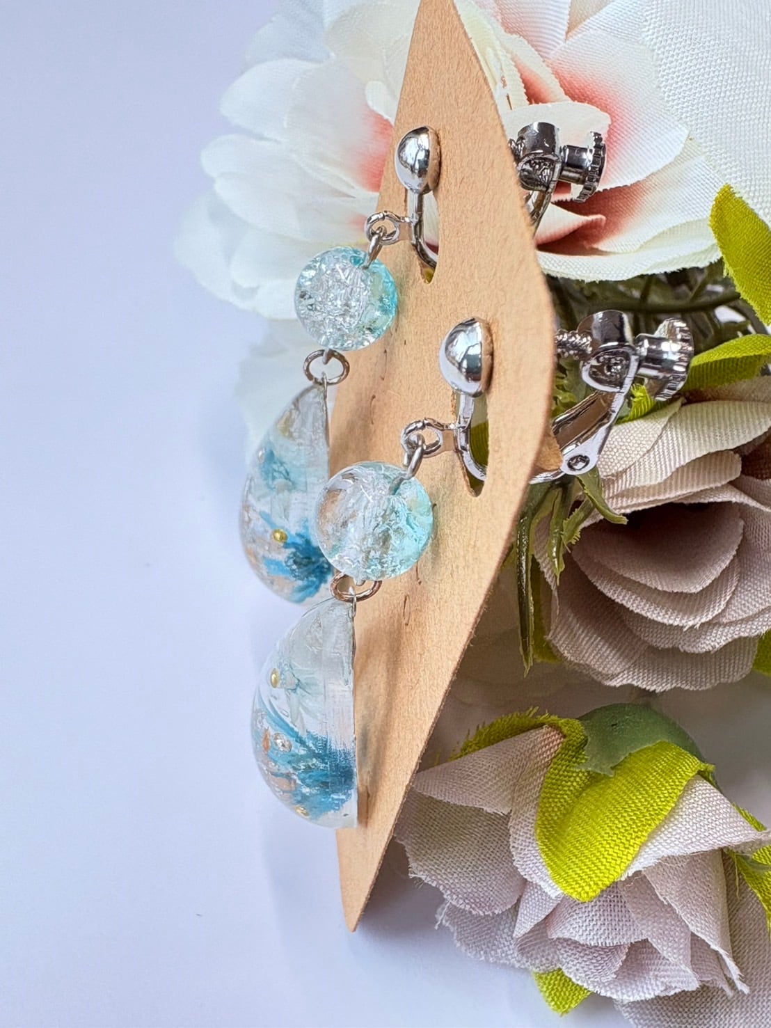 青と水色のドライフラワーを閉じ込めた雫型レジンイヤリングです