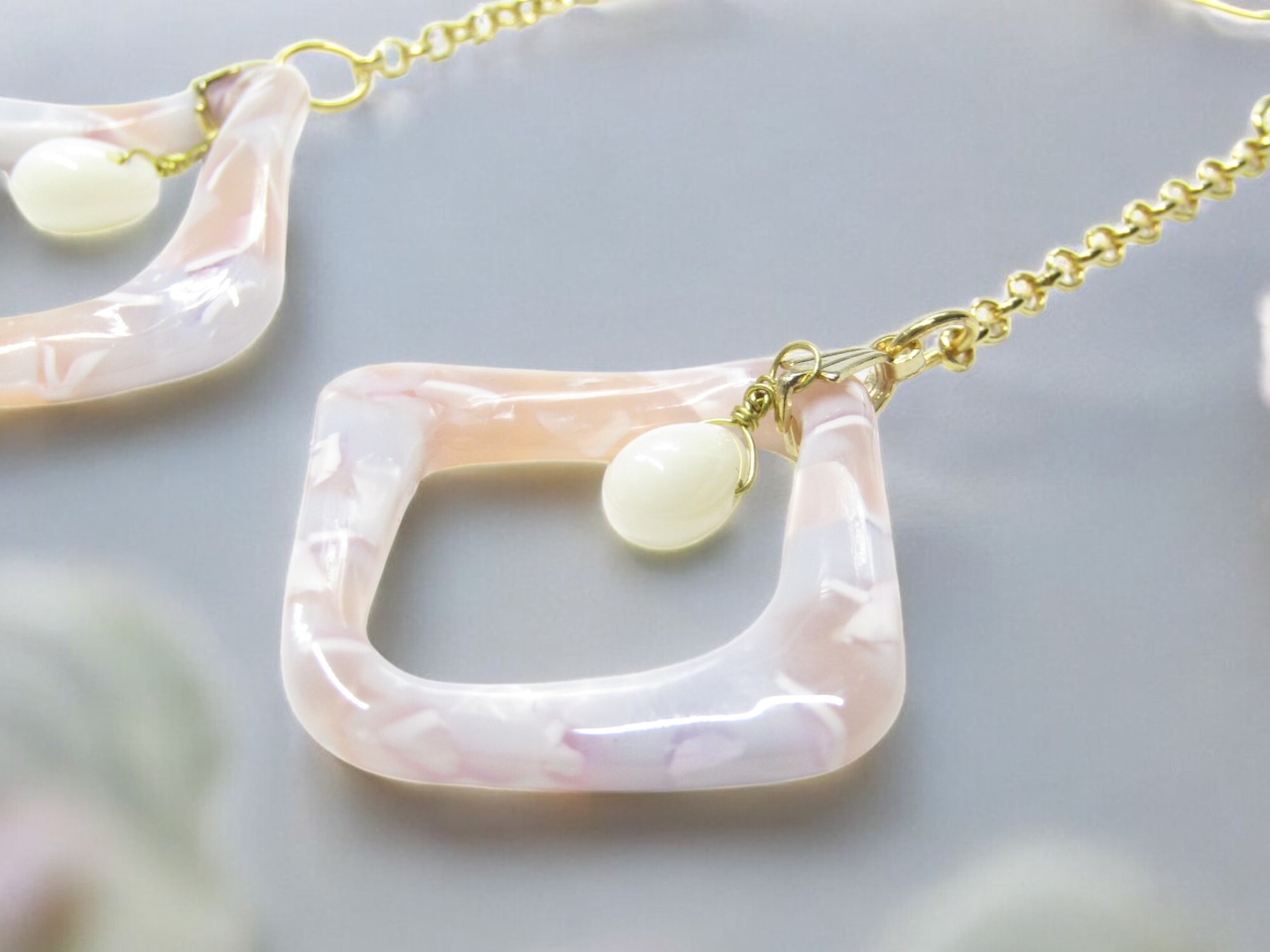 動きのあるデザインのスクエアパーツと長めのチェーンで動きのあるフックピアスです。